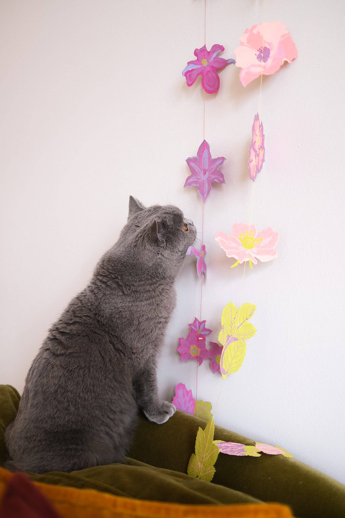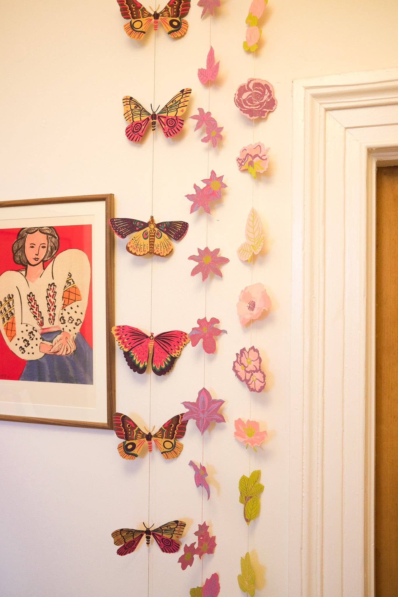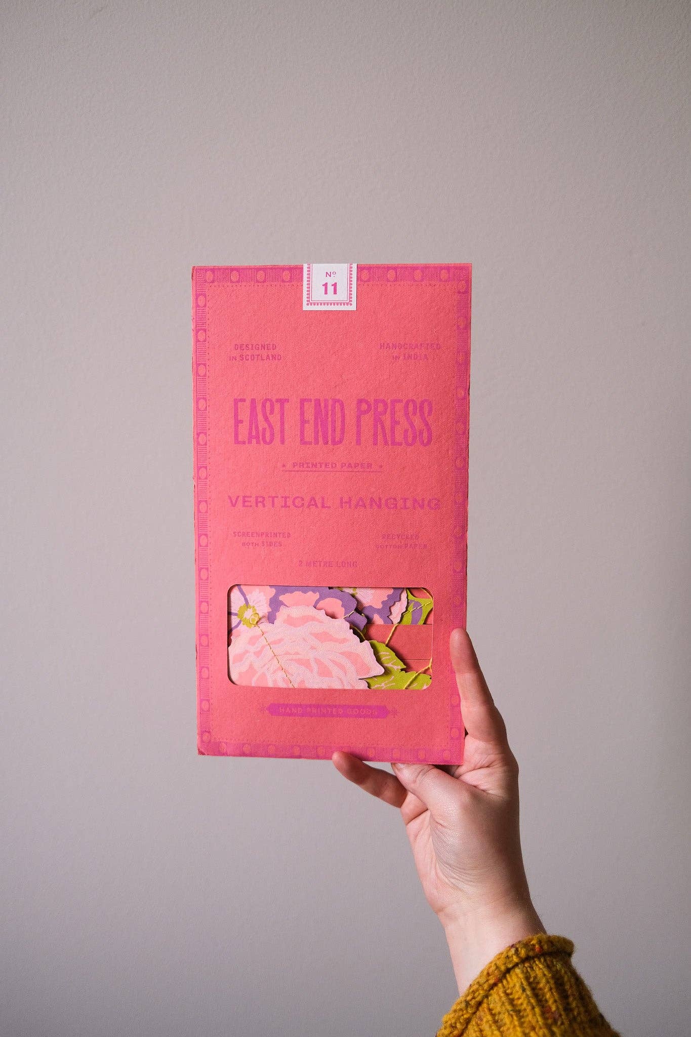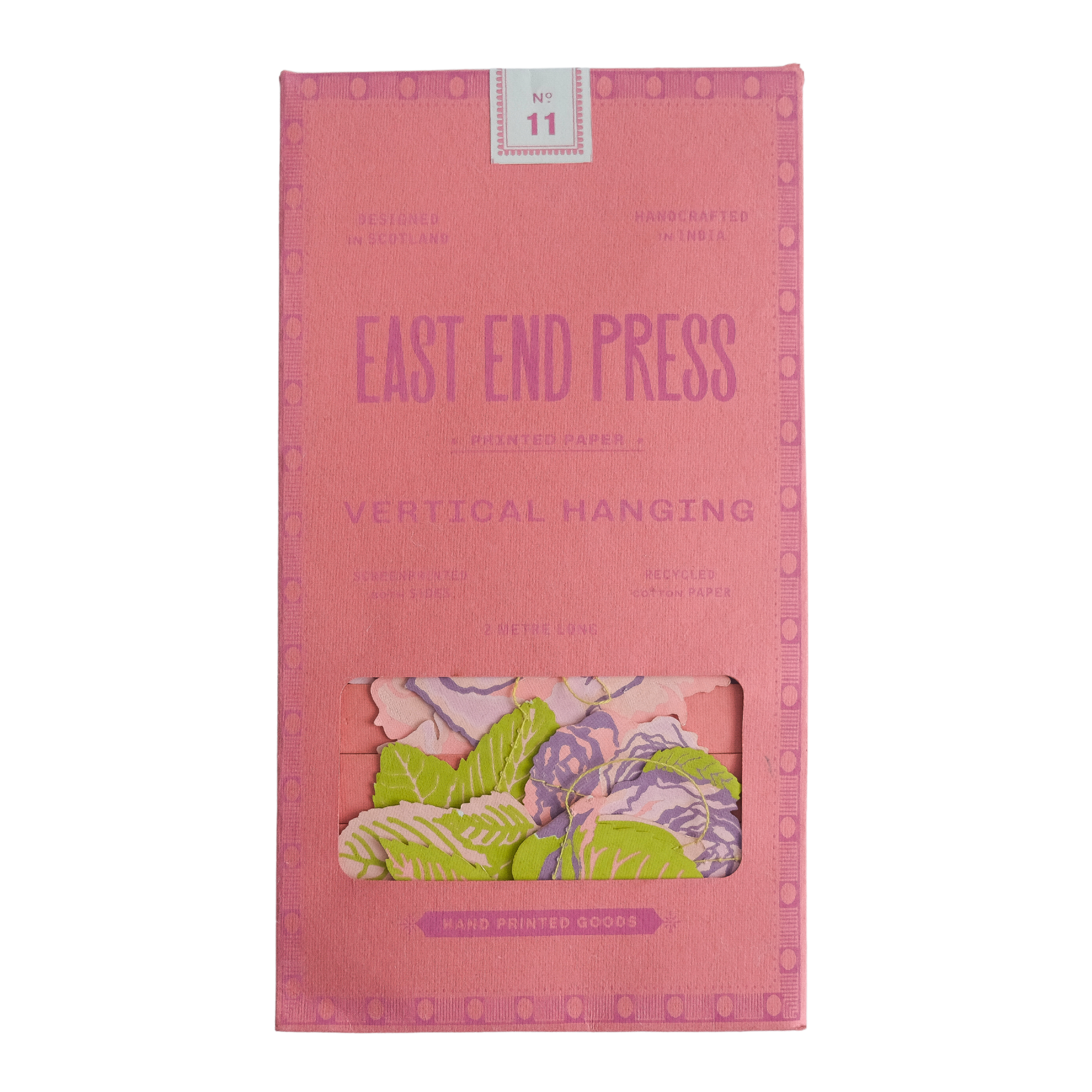 Formas florales de papel cosidas con hilo de algodón resistente. Serigrafía a mano por ambas caras por talentosos artesanos de Jaipur. Fabricado de forma sostenible con materiales reciclados.