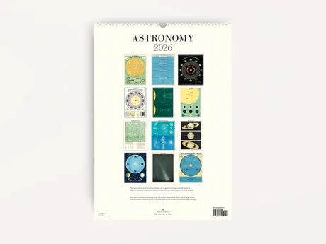 Este calendario de pared presenta doce imágenes de inspiración vintage que representan el mundo celestial.