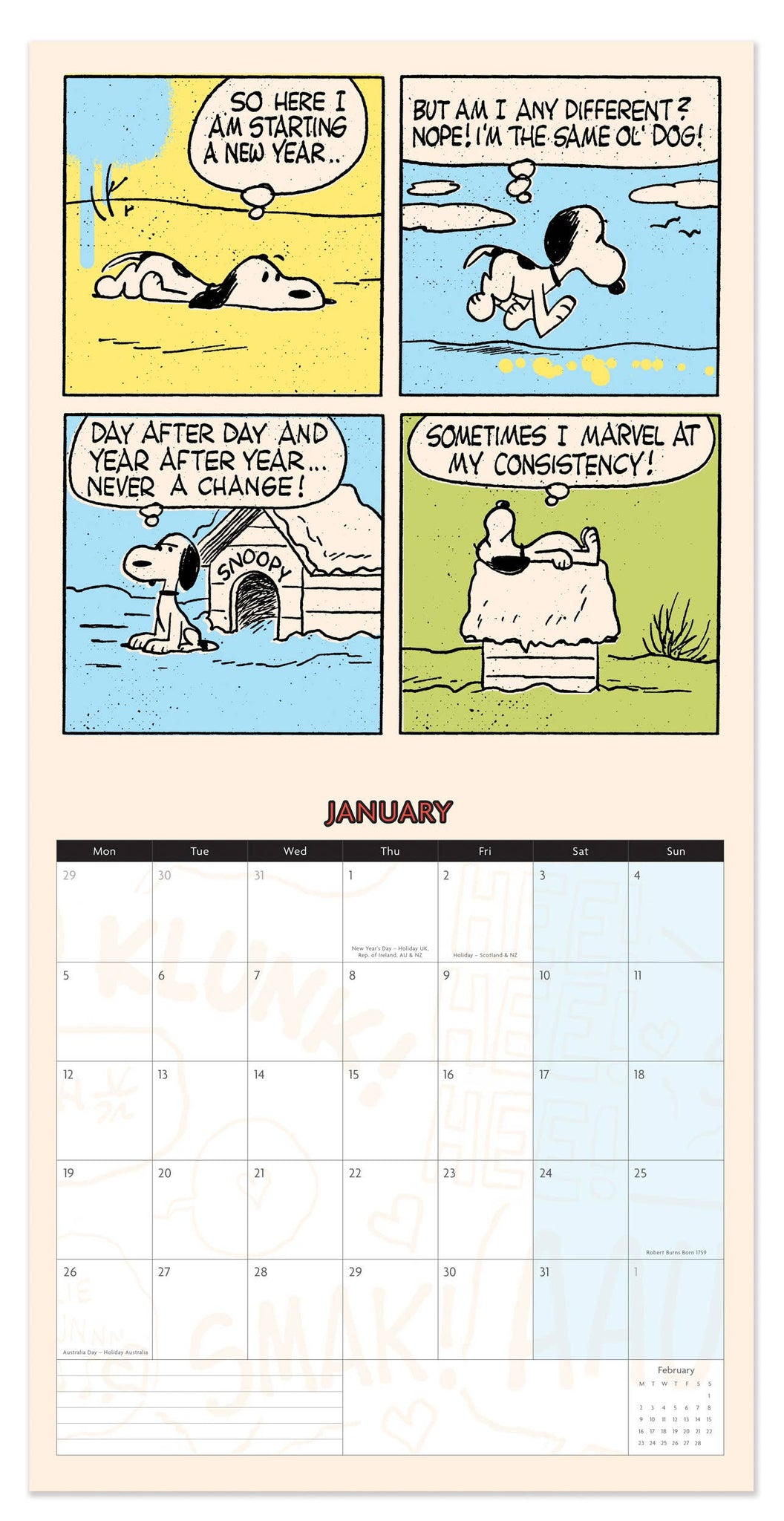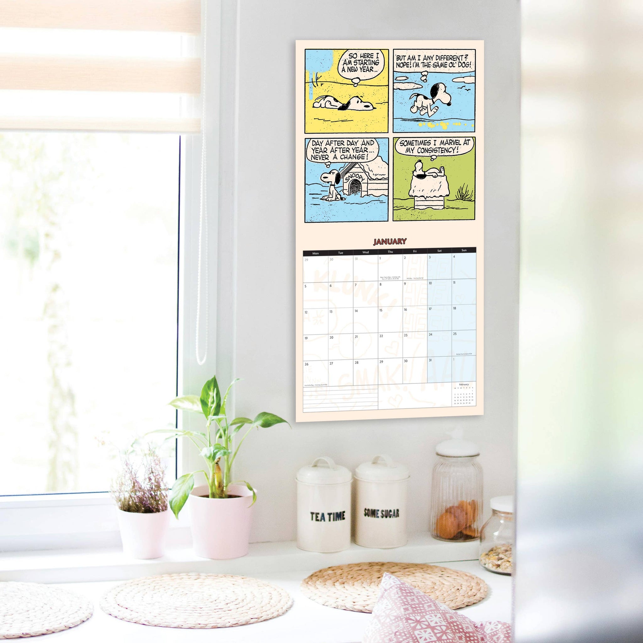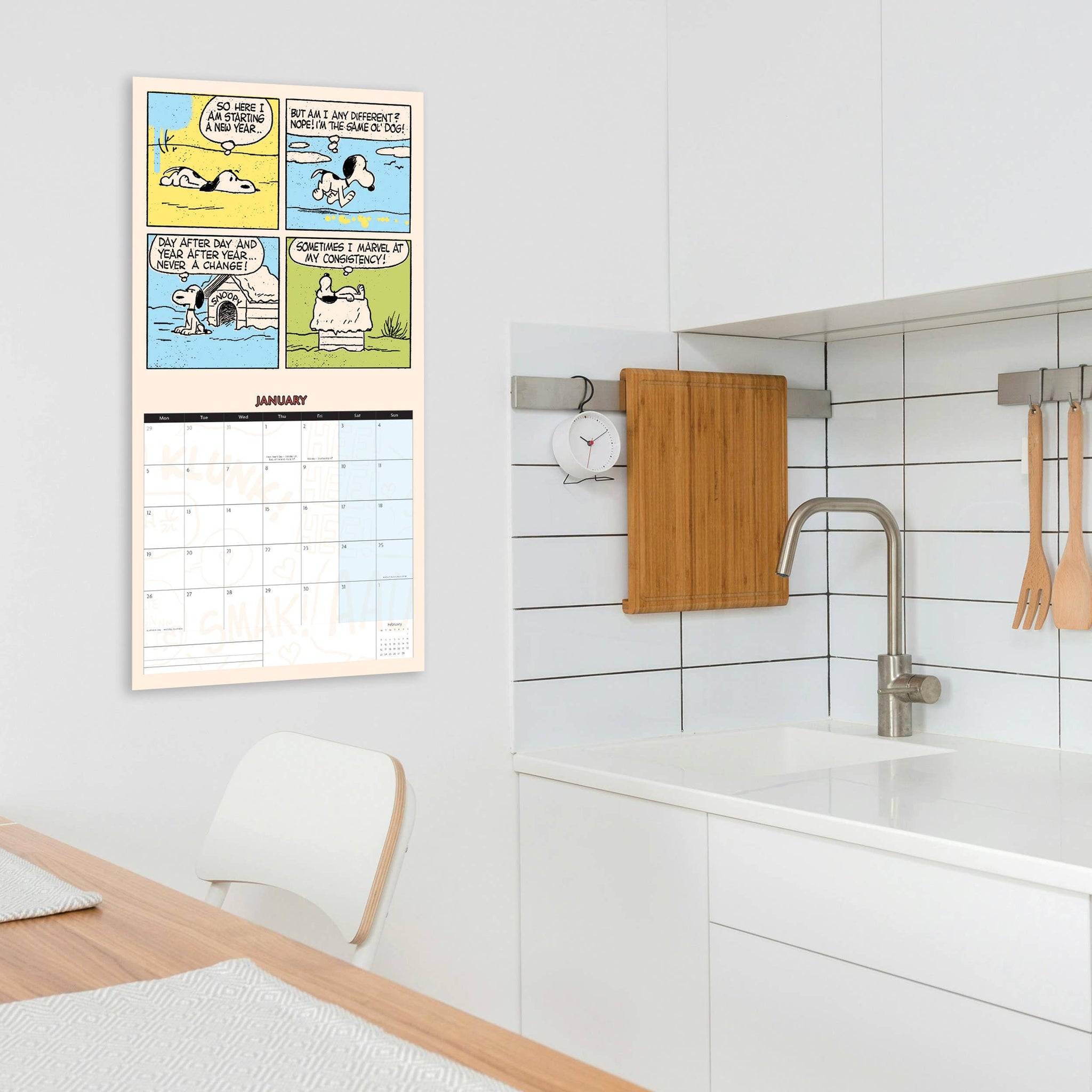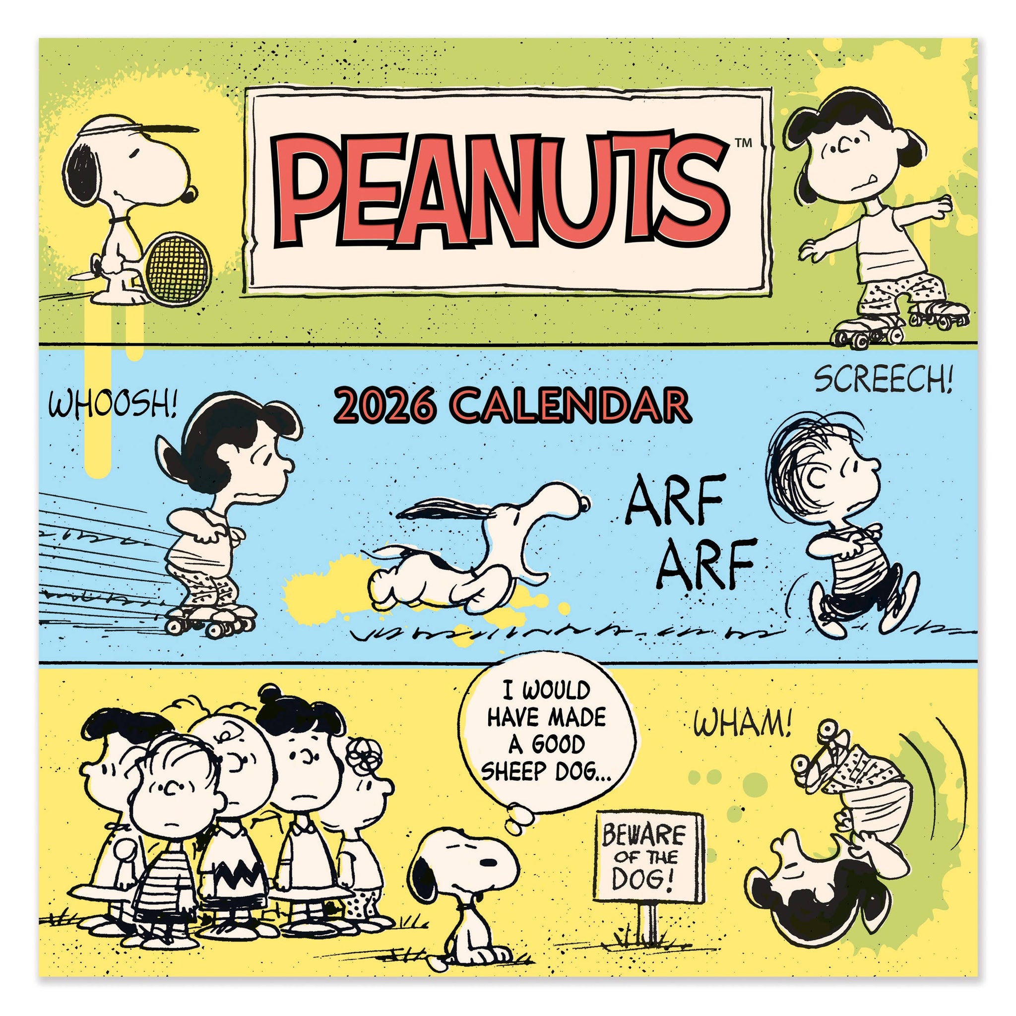 Calendario de pared cuadrado de Peanuts 2026. Basado en la icónica tira cómica de Charles M. Schultz, este calendario sigue siendo un clásico con una gran cantidad de seguidores fieles, tanto jóvenes como mayores.